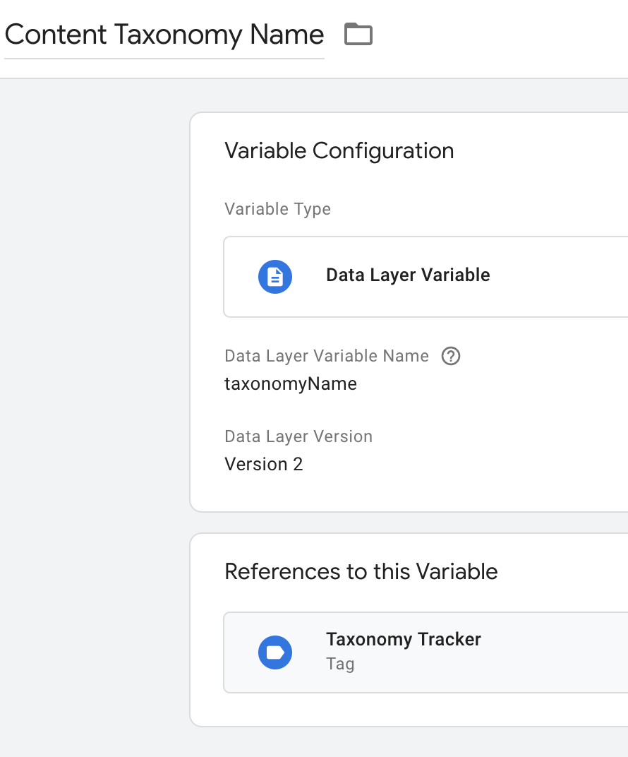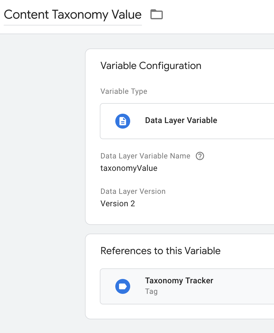 First, we’ll want to capture the taxonomyValue and taxonomyName datalayer attributes as Tag Manager datalayer variables.