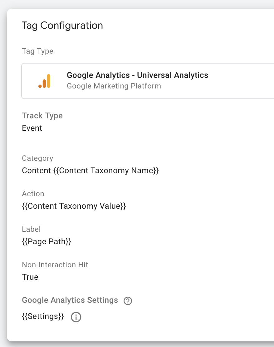 In other words, all we have to do to track our content’s tag-taxonomy (or authors or whatever other taxonomy we use) is create another Taxonomy Tracker tag. So for instance, to send our content’s tag-taxonomy data to Google Analytics we could just create a second Taxonomy Tracker that looks like this: