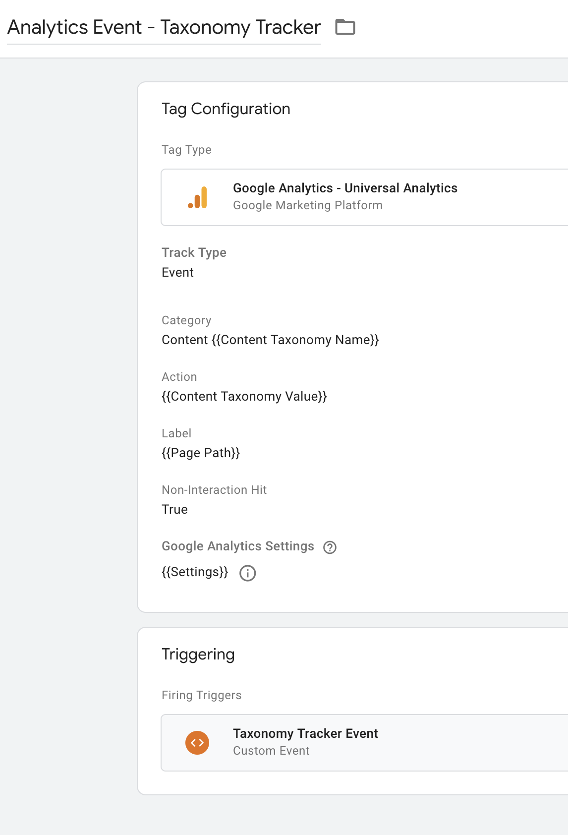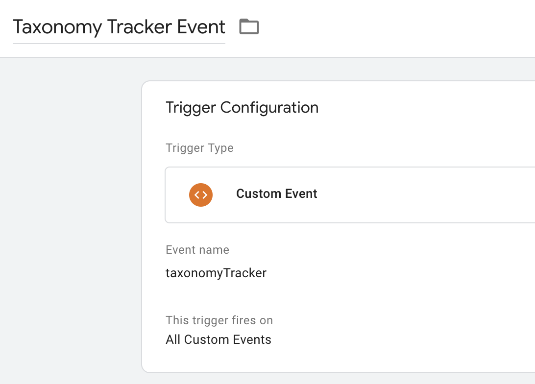 Finally, we need to trigger this event to fire for each category. To do so, we create a custom Custom Event trigger with event name = "taxonomyTracker" like so: