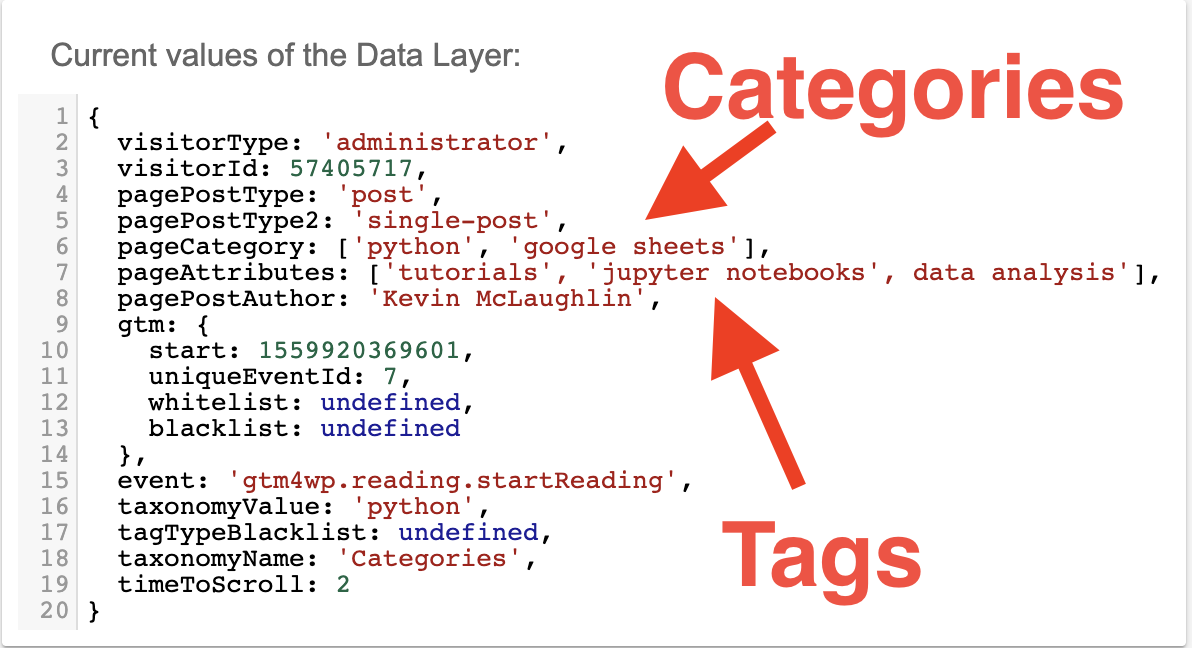 In the section just above we configured the tracker’s Taxonomy Name to "Categories" and the Taxonomy Values Array to the Page Categories - Array variable, which, in the example, has the values ‘python’ and ‘google sheets’.