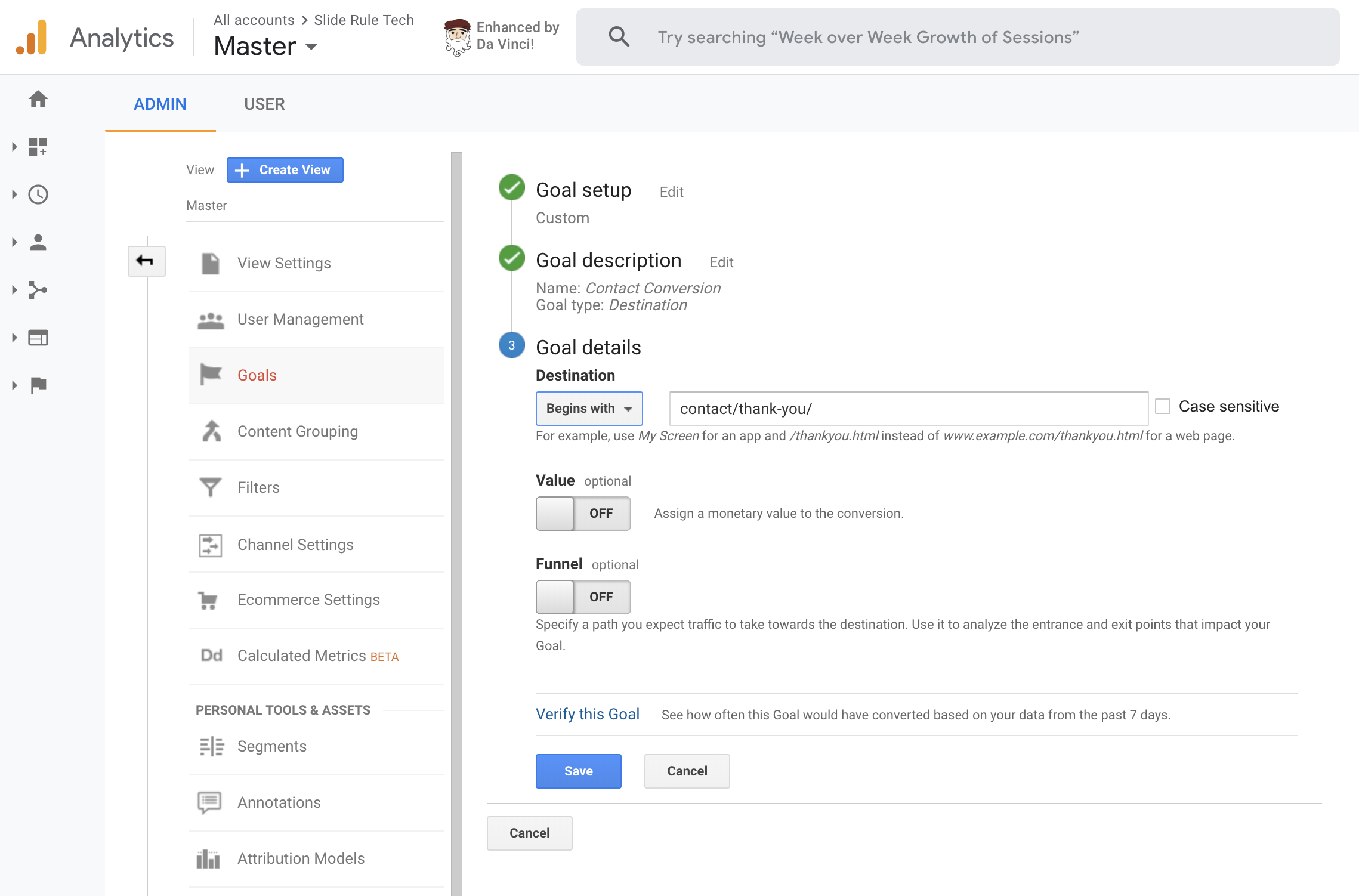 Unfortunately, while it is the most common, it is also is the worst way to track conversions. Sure, it’s easy and doesn’t require any technical skills, you just create the goal directly in Google Analytics like so: