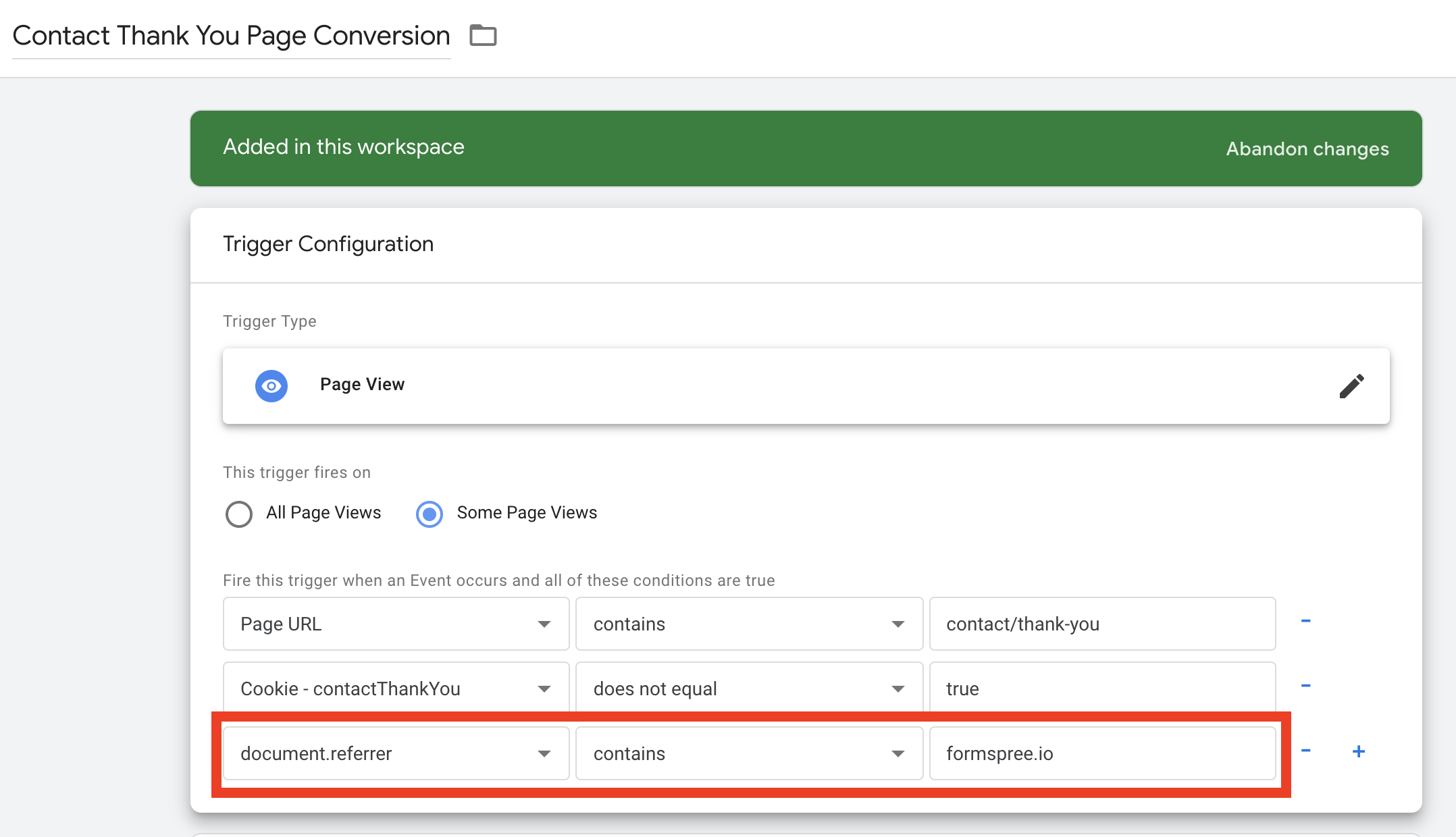 Then, I add a condition to the conversion trigger that says the document.referrer must contain formspree.io.